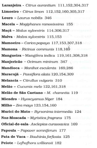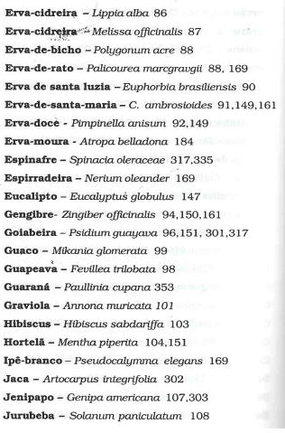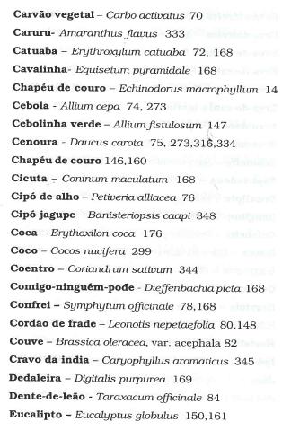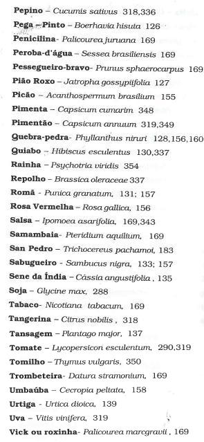 A lista a seguir consta do livro Plantas Medicinais de Uso Popular no Estado de Sergipe, que me foi presenteado por um dos autores Prof. Lauro Xavier Filho da Universidade Tiradentes (UNIT-Aracaju). Espero que possa ajudar em seu trabalho de pesquisa.
