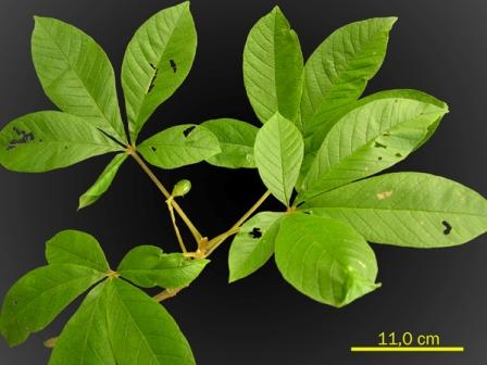 Espécie arboreo-arbustivo, alcança de 2 a 12 m, ramos alternos, dilatados, com cicatrizes nos nós, com pêlos ferrugíneos. Folhas compostas pentadigitadas ou ternadas, sendo maior o folíolo do meio.