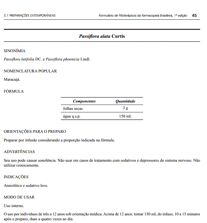 - Formulário de Fitoterápicos da Farmacopeia Brasileira. ANVISA, 1ª ed., p. 45,46,47, 88. 2011.