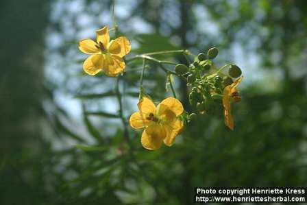 É subarbusto Caesalpinaceo, caracterizado por talos e ramos eretos, cor pálida e folhas compostas amarelo-esverdeadas. As flores são pequenas, agrupadas em racimos (cachos) e o fruto membranoso e deiscente.