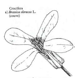 O termo "crucífero" (ou cruciforme) refere-se a uma característica comum da corola: dialipétala com quatro pétalas dispostas em cruz, opostas duas a duas com unhas ± longas (veja ilustração).